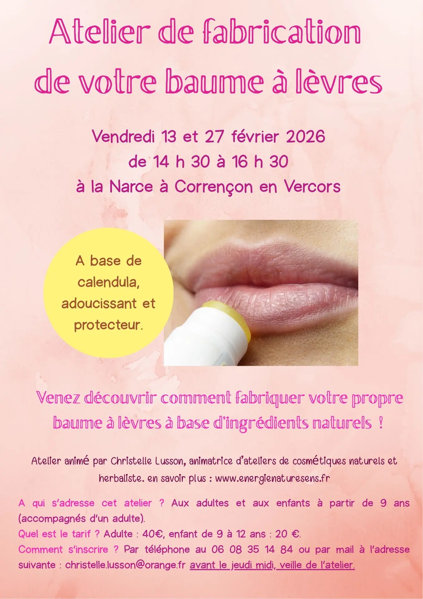 Partagez un temps convivial et créatif en petit groupe à la découverte des ingrédients naturels utilisés et du mode de fabrication avant de repartir avec votre propre baume à lèvres “fait maison”.